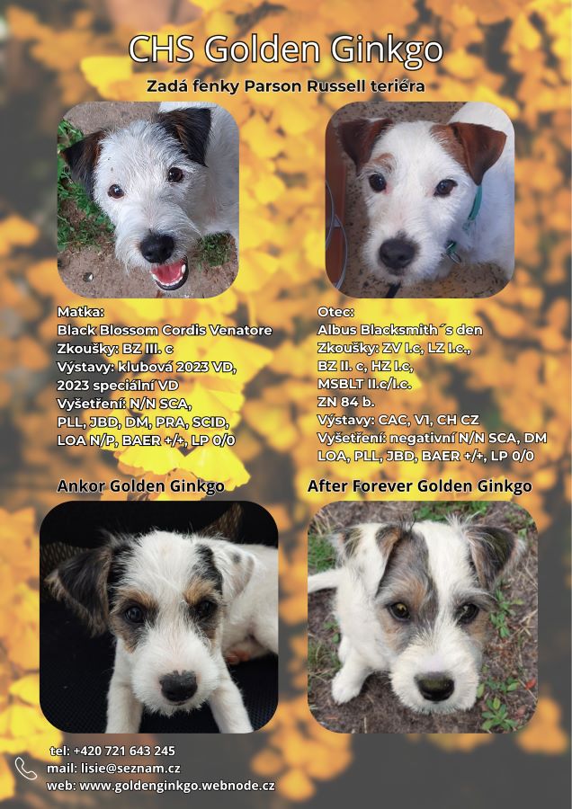 Vyšetření BAER oboustranné slyšící. Jsou zvyklé na kotec i byt, jízdu autem, jiné psy... Jen pro aktivní zájemce se zkušeností s chovem teriérů. Více info na webu www.goldenginkgo.webnode.cz
