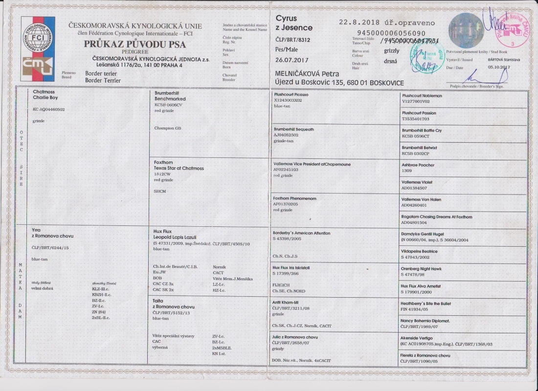 ZN, BZ I.c., coursingový certifikát, agility ,SA1,SA2,SA3, Terier roku KCHT 2019 -agilty 1.místo pes. Terier roku Agility 2020 - 1.místo Vítěz soutěže,ZZO, BH-VT, A3 CH, BZH II.c,