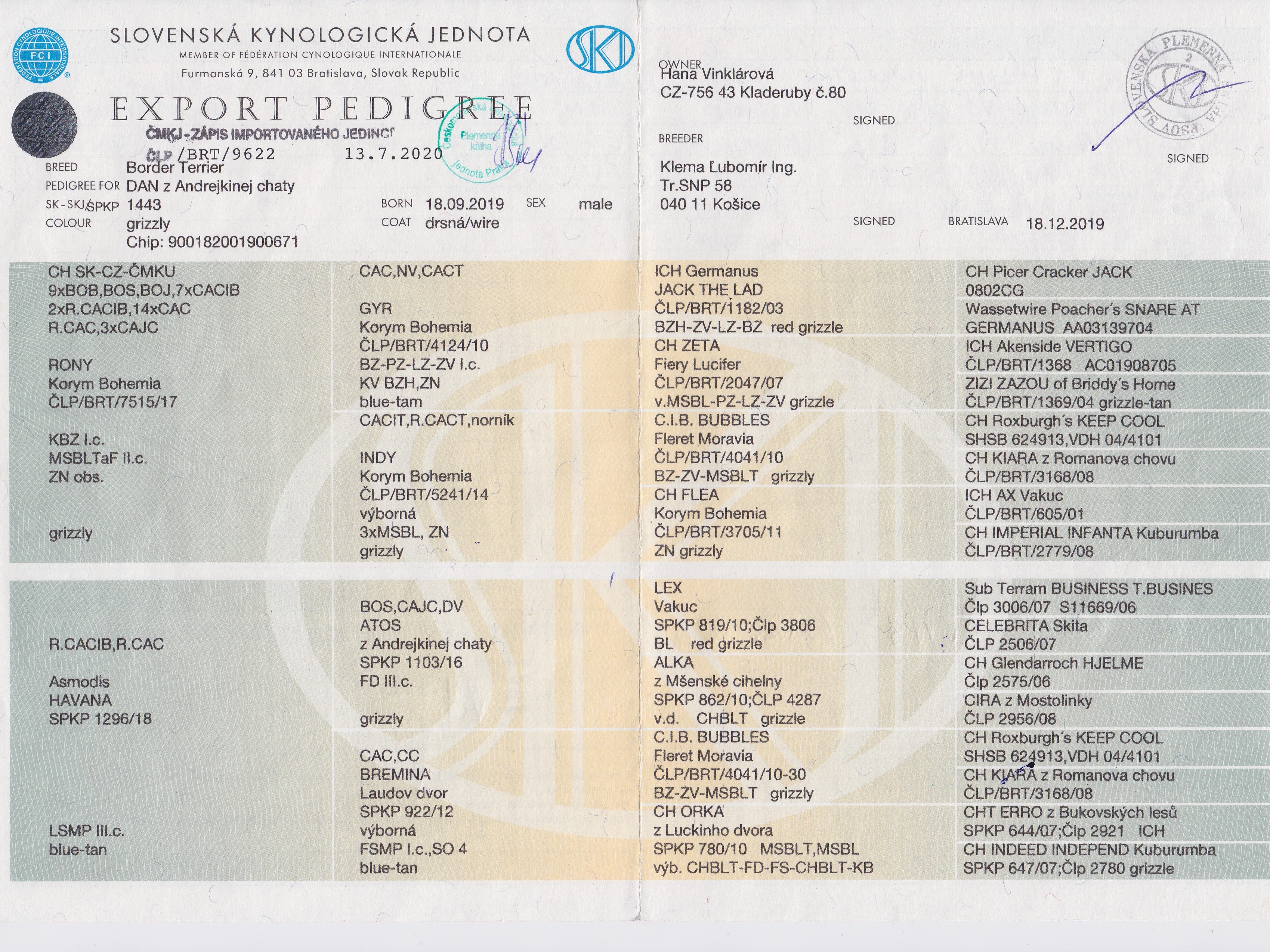 velmi dobrý, výborný,2x BOB, BOS, 3x BOJ,3x CAJC, 5x CAC, CACIB, r.CACIB, 3x CC, CH SK, Klubový CH SK, JCH SK