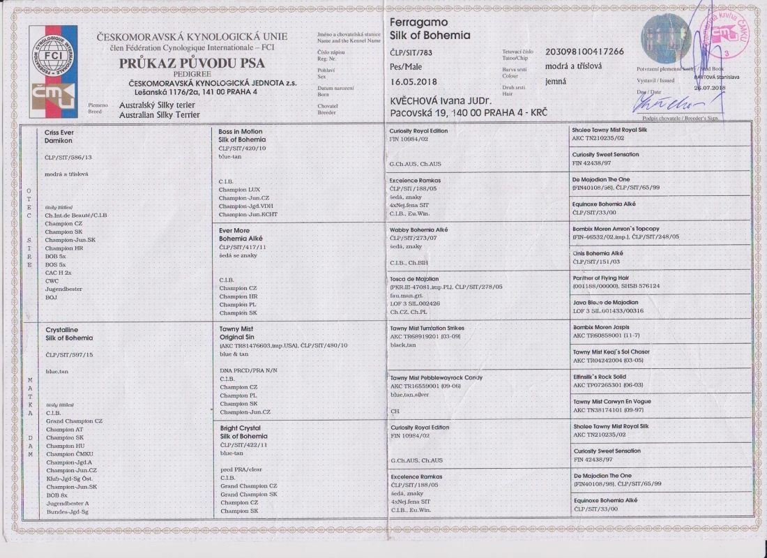 JCH CR,CH RO,GCH RO,CH CR,5x BOS,4xCACIBxr.CACIB,NV,11xCA,CC,3xCAJC,4.místo nejlepší silky terier KCHT
