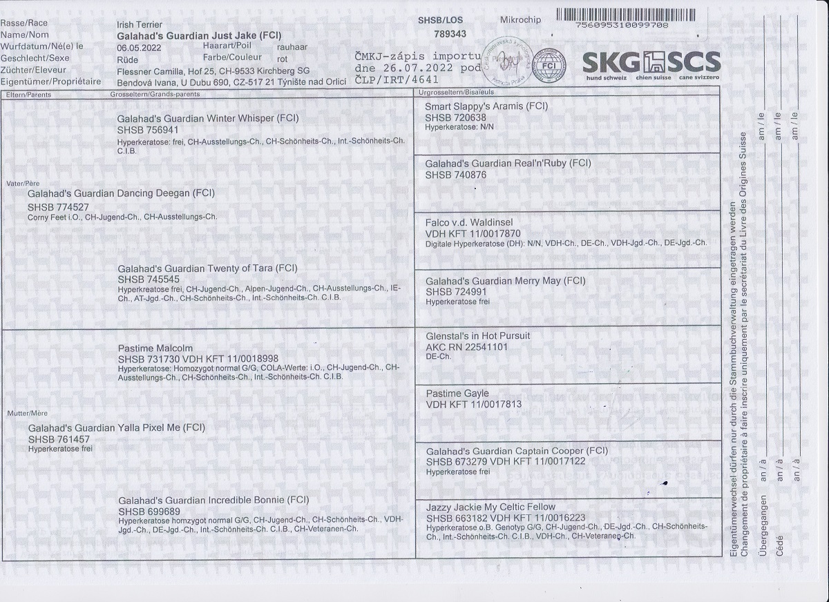 výborný, Vítěz speciální výstavy maldých, JCH KCHT, JCH CZ, JCH HU,JCH SK, JCH CH,CH CZ, CH CMKU, Klubový vítěz mladých, Interra Junior Winner, C.I.B.-J