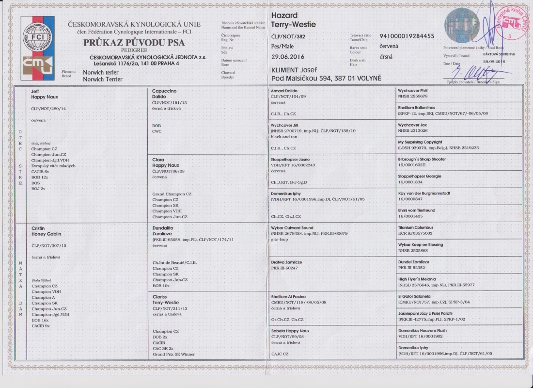 2x Vítěz třídy, Krajský vítěz, 2xCC, CAC,Klubový vítěz, BOB, r.CAC.r.CACIB, CH KCHT