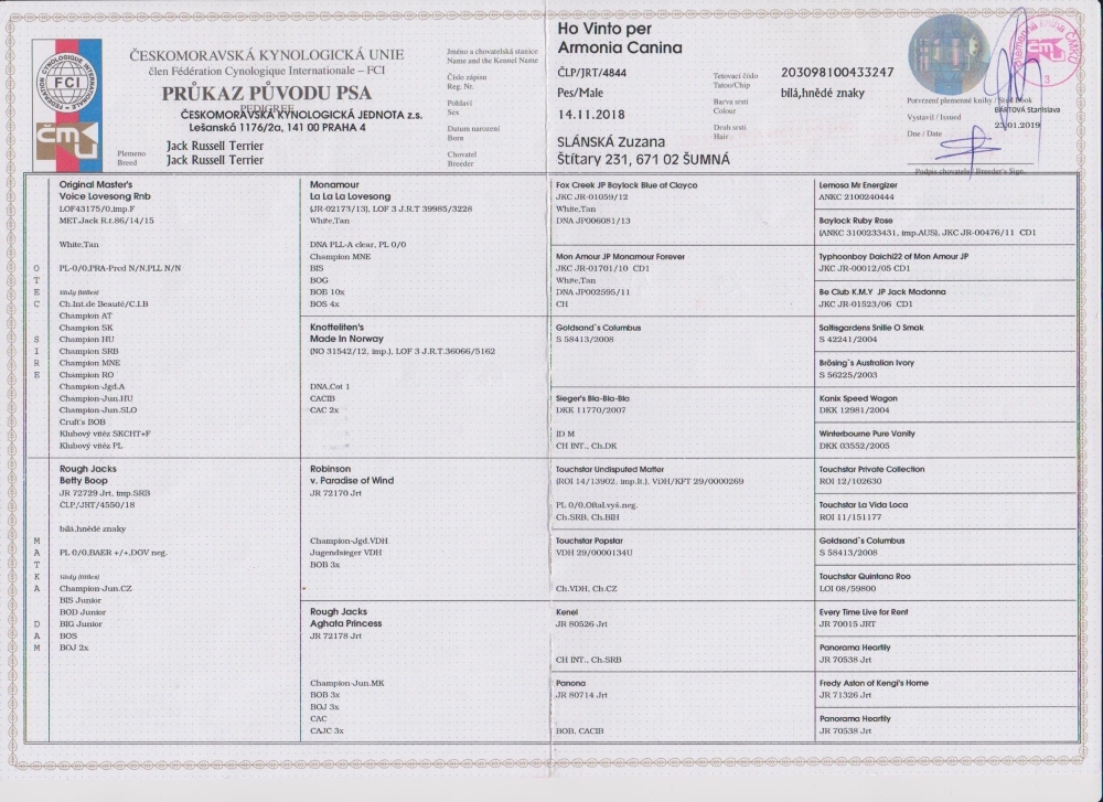 Puppy Winer Grand Prix Slovakia, výborný,5x CAJC, CCJ, Klub.vítěz mladých, 2x BOJ,, Terier roku KCHT 2019 4.místo,, Slovenský CH štěňat, JCH CZ