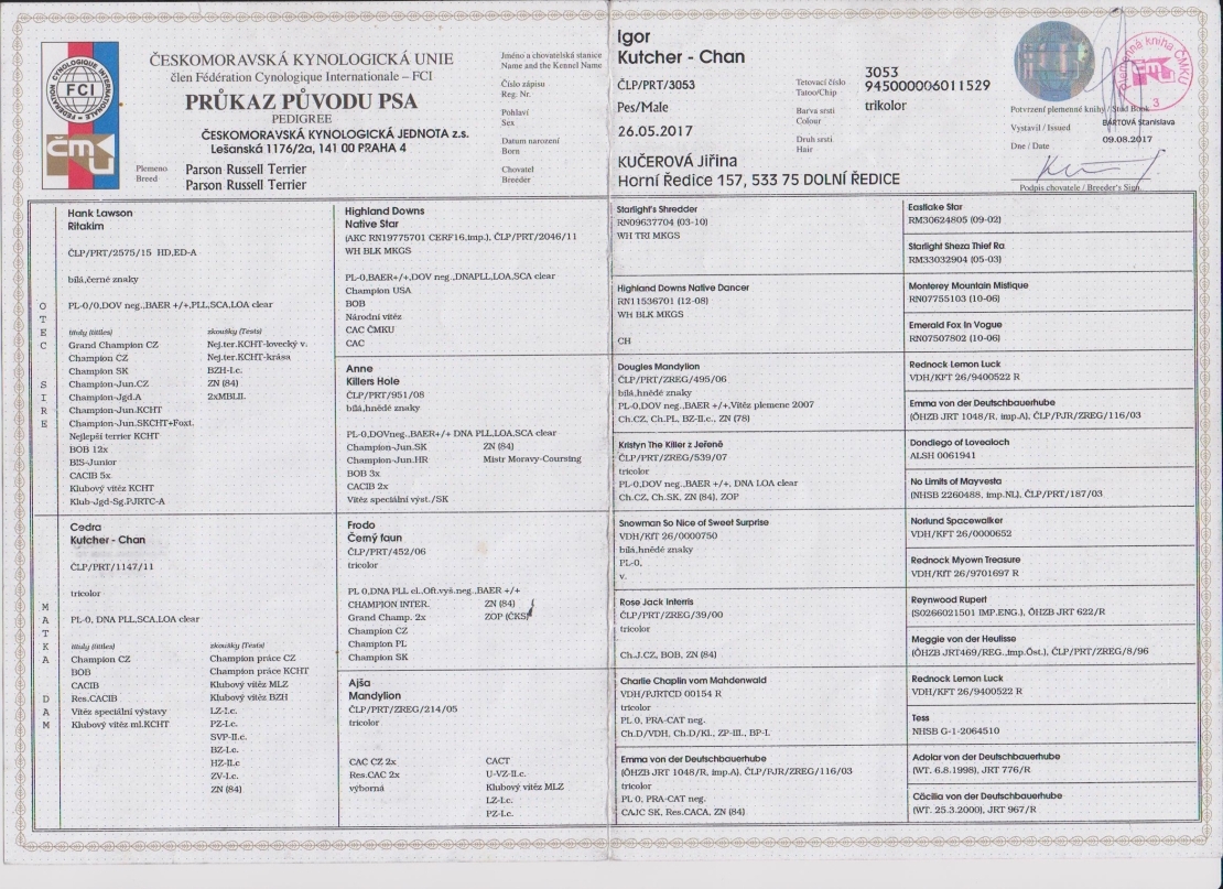 ZV I.c, ZN, ZVVZ I.c, LZ I.c, BZ I.c, 2 nejlepší pes PRT v soutěži lovecký výkon za rok 2018