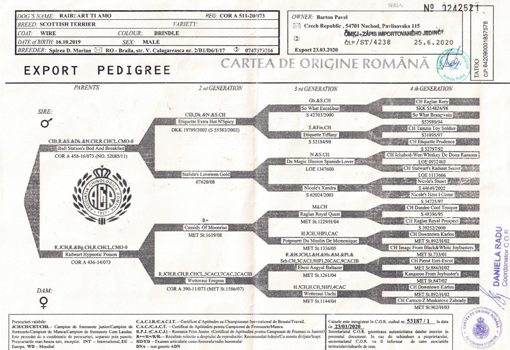 výborný, Vítěz třídy, CAJC,CCJ, Klubový vítěz mladých, 10x CAC, 3x CACIB, 3x BOS, 2x BOB, NV, Krajský vítěz, Best Dog, CH SK, Grand CH CZ