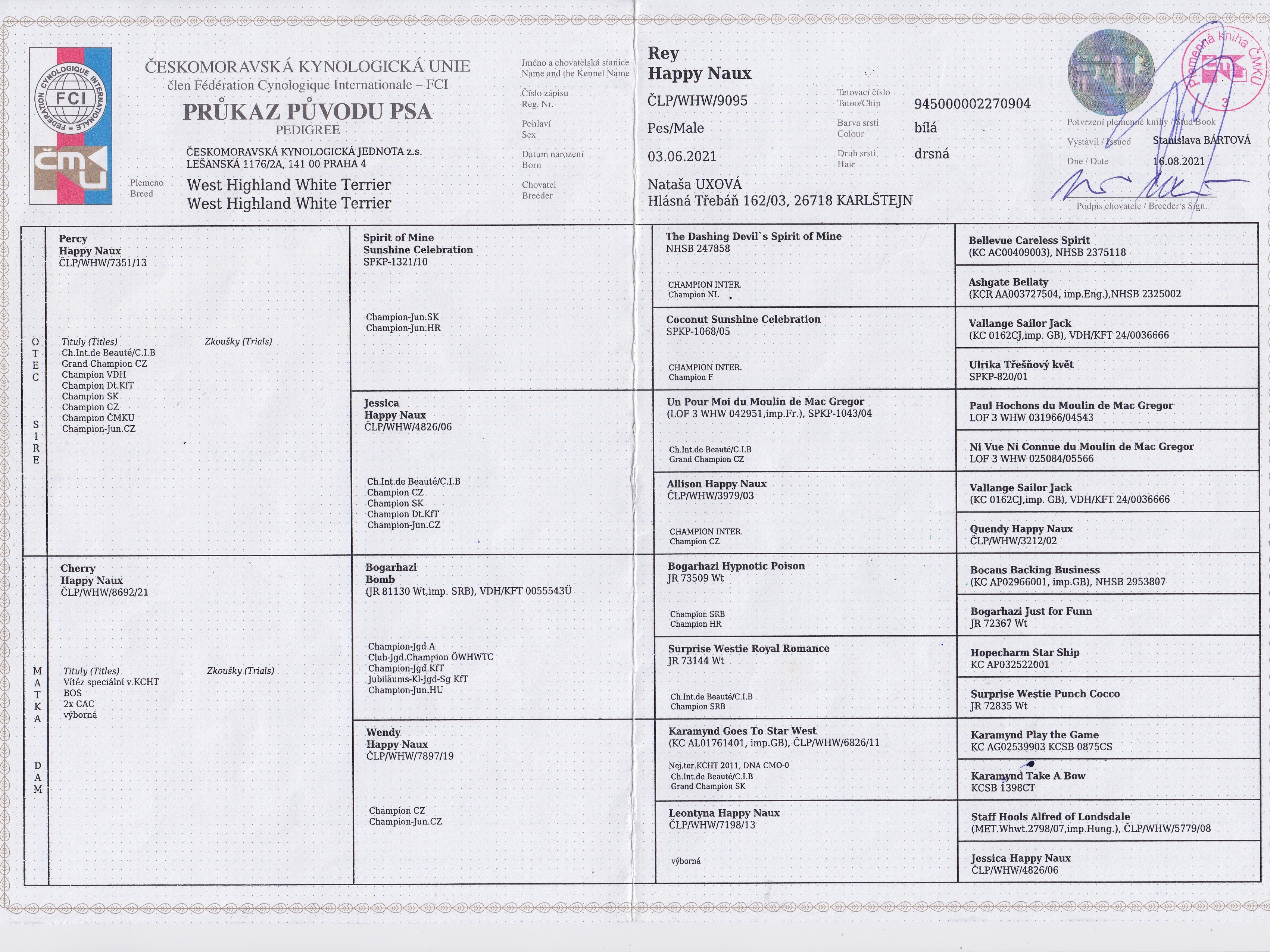 Datum | Výstava | Rozhodčí | Třída | Ocenění |